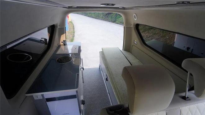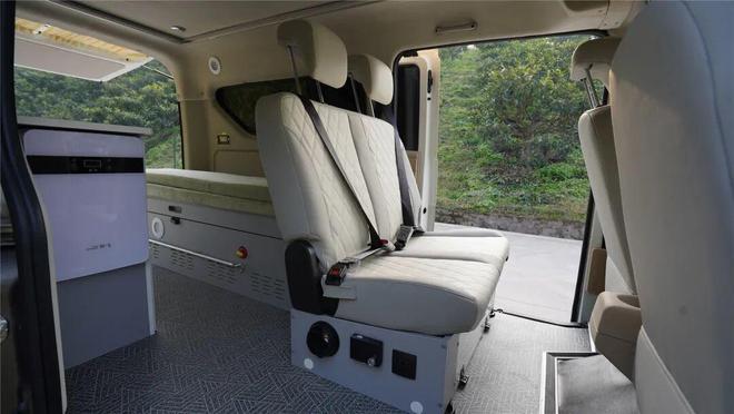 生活区通过“升顶+座椅折叠”实现空间重构:降顶状态下,后置纵床尺寸为1850×900mm,可容纳单人舒适睡眠;升顶后,电动升降床展开至2000×1100mm,形成双层睡眠区,满足一家三口需求。会客区采用双人汽车座椅,配合可折叠餐桌,日常可作办公区,夜间铺上垫子即变临时床位。